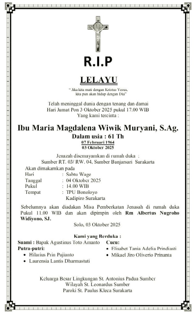 Posted on October 5, 2025 by YudiIstri Toto Amanto Wafat Maturnuwun Basuki, Sandy, Joko Waskito, dan Joko Subagyo (tidak nampak dalam foto) yang mewakili teman-teman melayat ke rumah duka.
